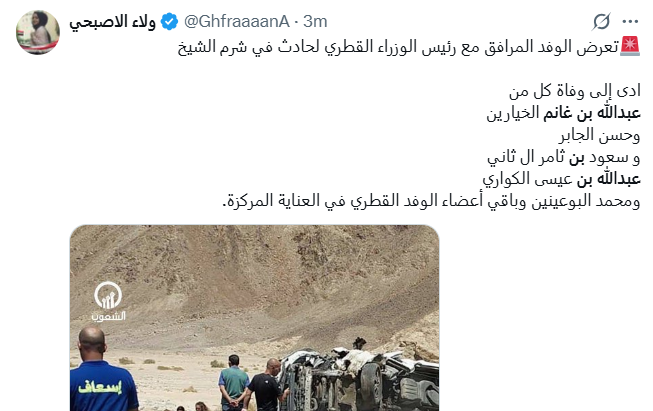 أعلن الإعلامي المصري عمرو أديب، وقوع حادث مروري قبل مدينة شرم الشيخ بـ50 كيلو يودي بحياة 3 من أفراد الوفد القطري المشارك في مفاوضات شرم الشيخ.